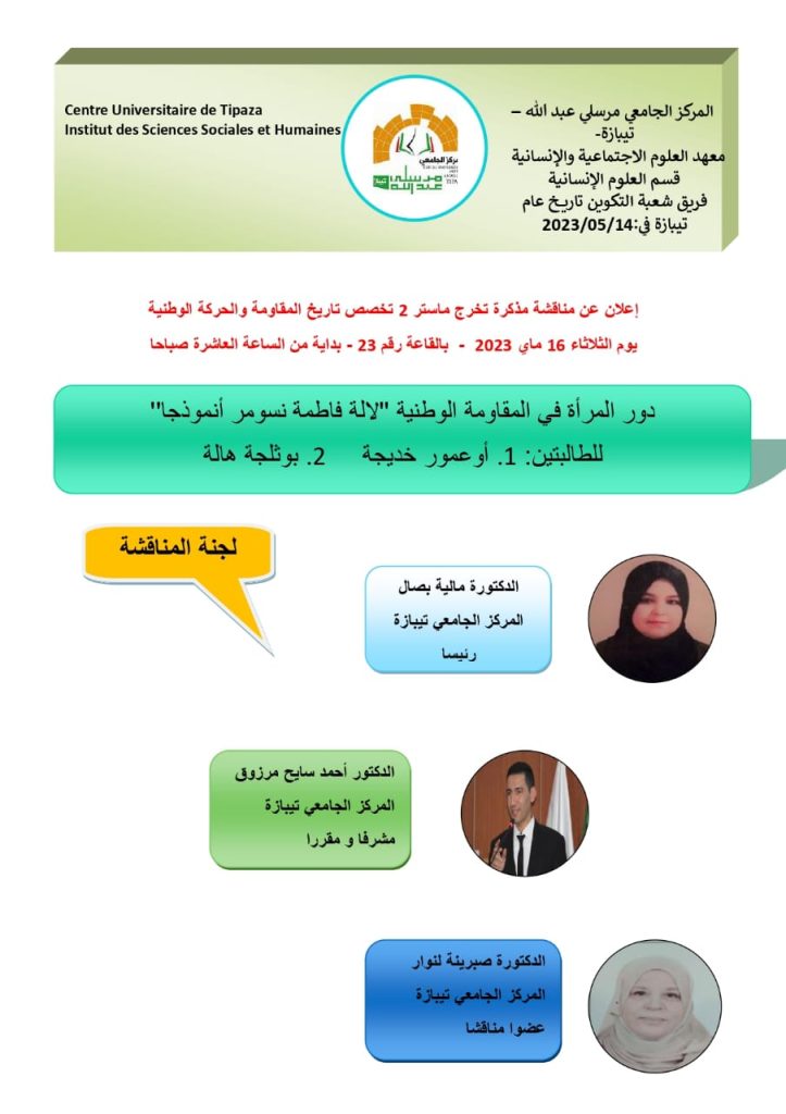 شعبة التاريخ بمعهد العلوم الانسانية تفتتح مناقشات مذكرات الماستر يوم الثلاثاء بداية من الساعة العاشرة صباحا بالقاعة 23 كونوا في الموعد.