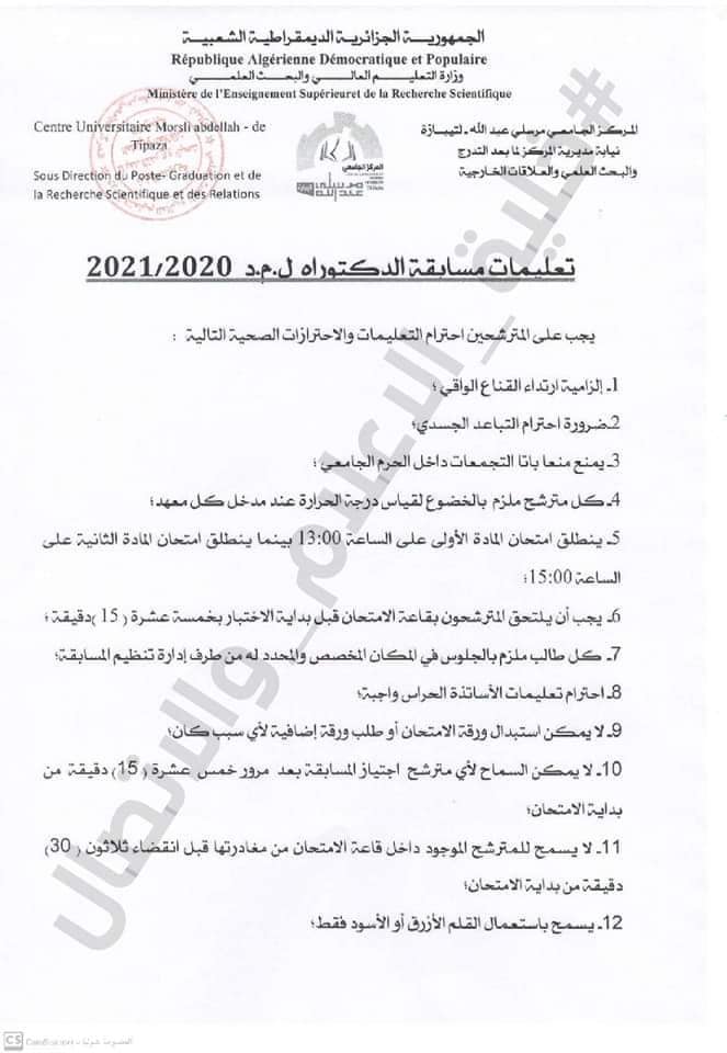 يتوجب على المترشحين لاجتياز مسابقة الدكتوراه ل-م-د لسنة 2021/2020 بالمركز :الجامعي مرسلي عبد الله تيبازة ،الالتزام بالتعليمات والإجراءات التالية