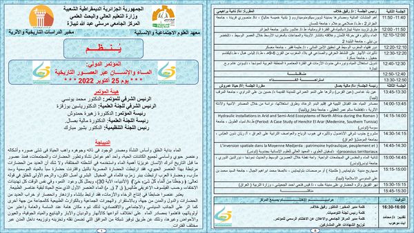 في ختام أشغال المؤتمر الدولي الماء والإنسان عبر العصور المنظم من طرف مخبر الدراسات التاريخية والأثرية ومعهد العلوم الإجتماعية والإنسانية تحت رعاية المركز الجامعي مرسلي عبد الله تيبازة وعلى رأسها الدكتور محمد يونسي، وبعد عرض وتقديم مايقارب 80 مداخلة علمية بمشاركة أساتذة وباحثين من داخل وخارج الوطن، وجمع توصيات الأساتذة المشاركين، اجتمعت لجنة صياغة التوصيات لتخلص إلى إقرار التوصيات التالية