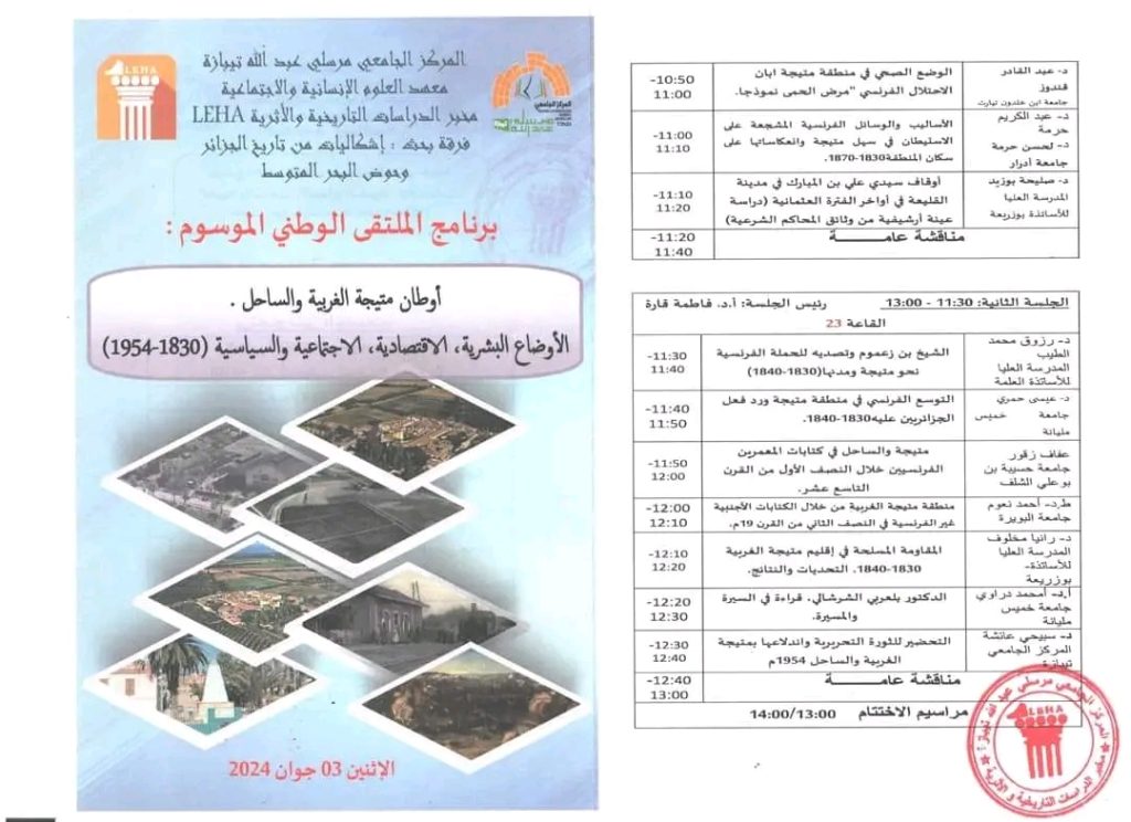 الملتقى الوطني الموسوم بأوطان متيجة الغربية والساحل الأوضاع البشرية، الإقتصادية، لإجتماية والسياسية
