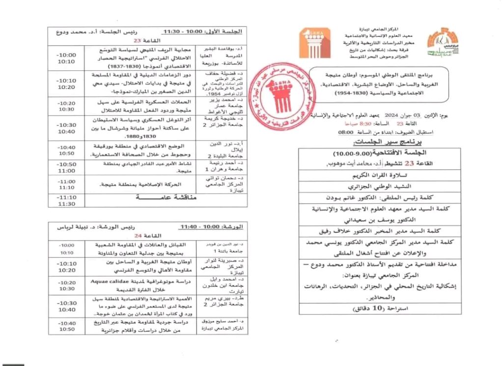 من فعاليات الملتقى الوطني اوطان متيجة الغربية والساحل. الأوضاع البشرية، الاقتصادية، الاجتماعية والسياسية 1830-1954 المنظم من طرف مخبر الدراسات التاريخية والأثرية للمركز الجامعي تيبازة بمشاركة 13 مؤسسة جامعية وطنية.
