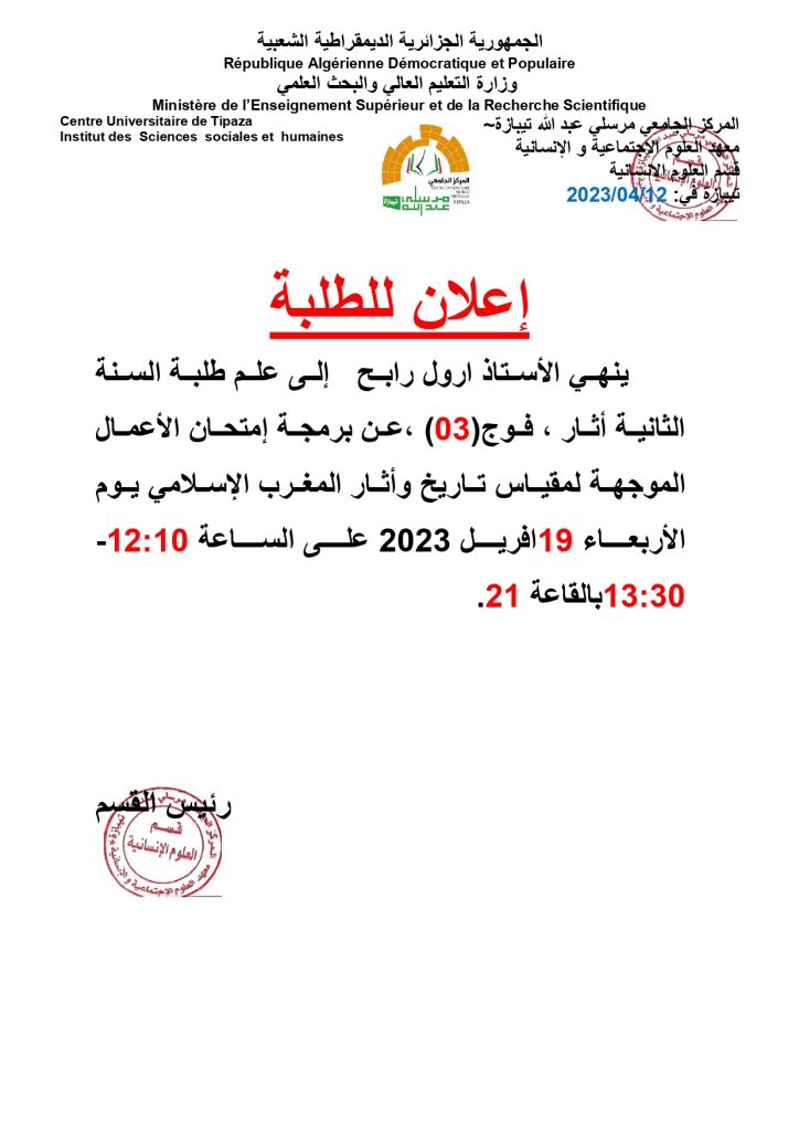 الرئيسية/إعلانات/برمجة إمتحان في حصة الأعمال الموجهة إعلاناتطلبة برمجة إمتحان في حصة الأعمال الموجهة 12 أبريل 2023 270 أقل من دقيقة 12 أبريل 2023 270 أقل من دقيقة اظهر المزيد شاركها فيسبوك تويتر لينكدإن مشاركة عبر البريد طباعة