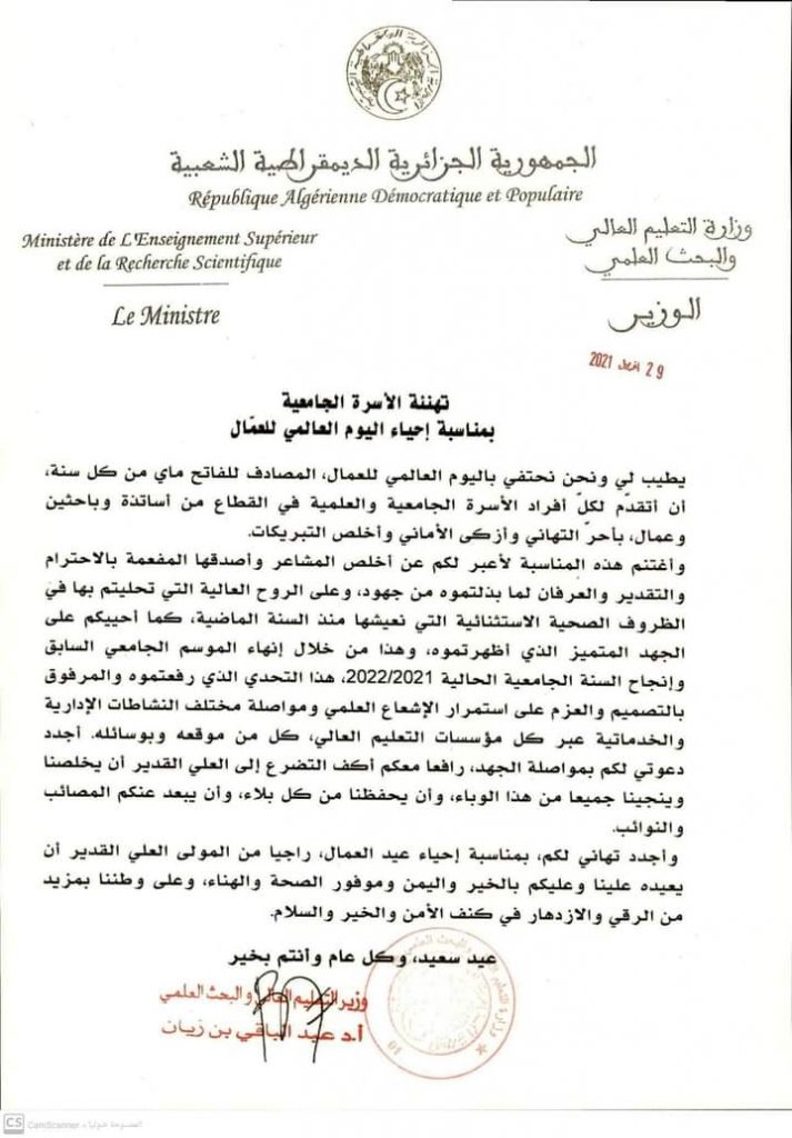 يتقدم السيد عبد الباقي بن زيان وزير التعليم العالي و البحث العلمي بتهنئة الأسرة الجامعية