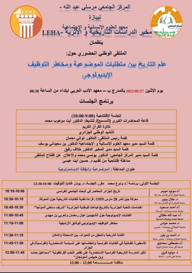 مخبر الدراسات التاريخية والأثرية بمعهد العلوم الإنسانية والإجتماعية ينظم ملتقى وطني حضوري حول علم التاريخ بين متطلبات الموضوعية ومخاطر التوظيف الإيديولوجي
