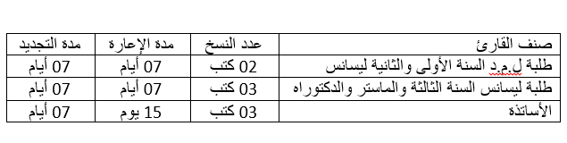 تحدد أوقات الإعارة لكل رواد المكتبة من الساعة التاسعة 9:00 سا صباحا إلى الساعة الثالثة والنصف بعد الزوال 15:30 سا، وتكون خدمة الإعارة لكل الفئات، طلبة ل.م.د، ماستر، دكتوراه وأساتذة.