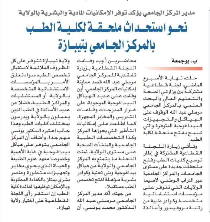 في اطار إنشاء كليات_طب_جديدة على المستوى الوطني حلت يوم الخميس 19جانفي 2023 بالمركز الجامعي مرسلي عبد الله تيبازة لجنة مشتركة بين وزارة التعليم العالي والبحث العلمي ووزارة الصحة قصد معاينة امكانيات المركز الجامعي لهذا الغرض. حيث تفقدت اللجنة عديد الهياكل البيداغوجية الموجودة في المركز على غرار المدرجات وقاعات التدريس والمخابر المجهزة، كما اطلعت اللجنة على امكانيات التأطير التي يحوزها المركز، من جهة أخرى إطلعت اللجنة على التخصصات الطبية الجامعية وكذا المنشآت الصحية على مستوى الولاية. وقد ثمنت اللجنة ما يتمتع به المركز والولاية من هياكل بيداغوجية وبنى تحتية وكوادر بشرية مؤهلة لفتح تخصص الطب مستقبلا