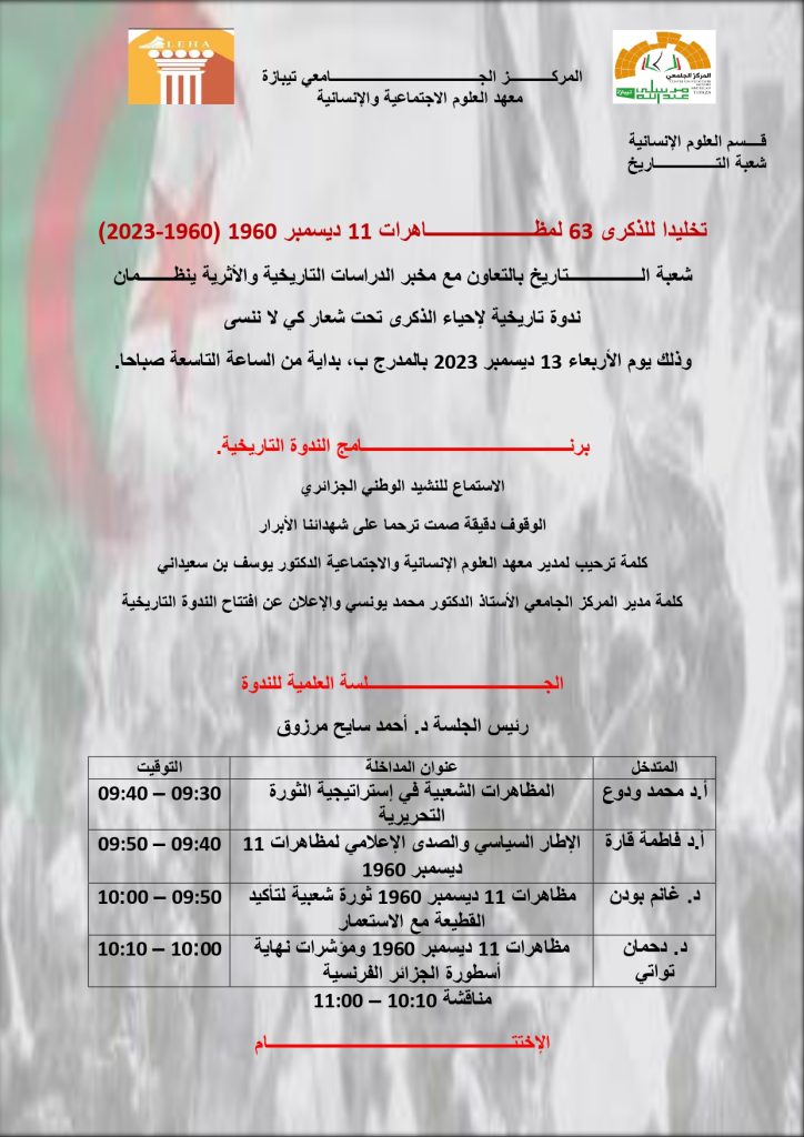 نظمت شعبة التاريخ اليوم 13 ديسمبر 2023 بالتعاون مع مخبر الدراسات التاريخية والأثرية ندوة تاريخية لإحياء الذكرى63 لمظاهرات 11 ديسمبر 1960 تحت شعار كي لا ننسى بالمدرج ب وذلك بحضور مدير معهد العلوم الإجتماعية والإنسانية والأساتذة المتدخلين بمداخلات قيمة في صلب الموضوع وكذا حضور طلبة لمعهد