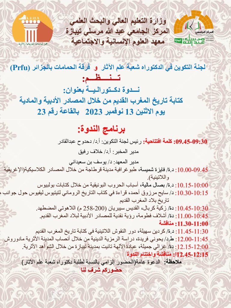 الرئيسية/Slider/ندوة دكتورالية بعنوان كتابة تاريخ المغرب القديم من خلال المصادر الأدبية والمادية Sliderأساتذةأيام تكوينيةأيام دراسيةإعلاناتالتظاهرات العلمية للمخبرتظاهرات علميةطلبةمخبر الدراسات التاريخية و الأثرية ندوة دكتورالية بعنوان كتابة تاريخ المغرب القديم من خلال المصادر الأدبية والمادية 6 نوفمبر 2023 431 أقل من دقيقة 6 نوفمبر 2023 431 أقل من دقيقة اظهر المزيد شاركها فيسبوك تويتر لينكدإن مشاركة عبر البريد طباعة