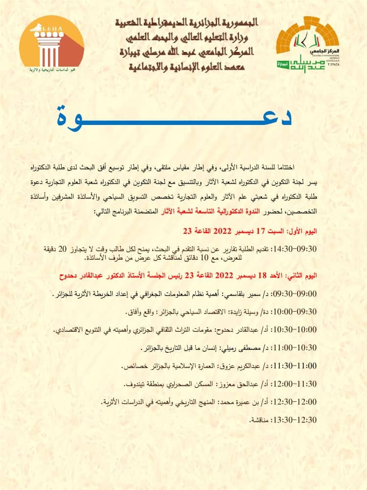 في إطار سلسلة الندوات الدكتورالية،قامت شعبةعلم الأثاريومي السبت والأحد 18/17 ديسمبر 2022 بمعهد العلوم الإنسانية والإجتماعية بالمركز الجامعي مرسلي عبد الله بندوة دكتورالية تجمع بين تقييم طلبة الدكتوراه في مدى تقدمهم في عملية البحث فيما يخص الأطروحة.وذلك بقيام كل طالب بعرض الحصيلة السنوية التي تتضمن البحث كذلك بمشاركة نخبة من الأساتذة بمداخلات قيمة مذكورة في البرنامج أدناه.