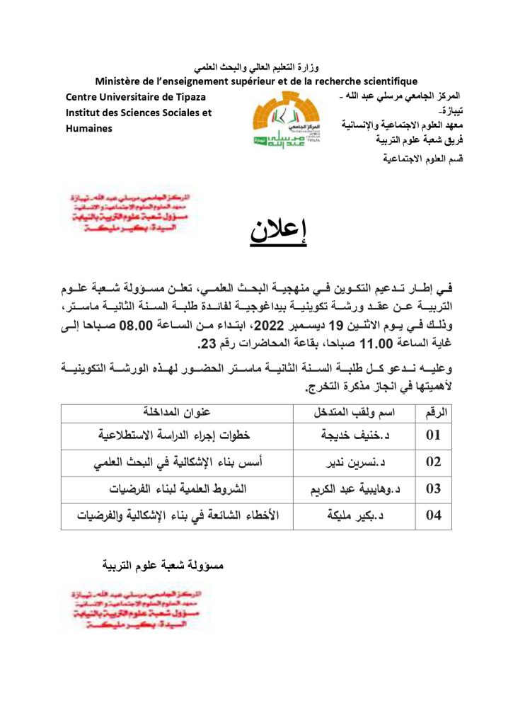 في إطار سلسلة الأيام التكوينية،قامت يوم الإثنين 19 ديسمبر 2022 شعبة علوم التربية بالمركز الجامعي مرسلي عبد الله بورشة تكوينية حول “منهجية البحث العلمي لإعداد مذكرة التخرج ” .شارك فيها نخبة من الاساتذة بمداخلات مميزة من بينها