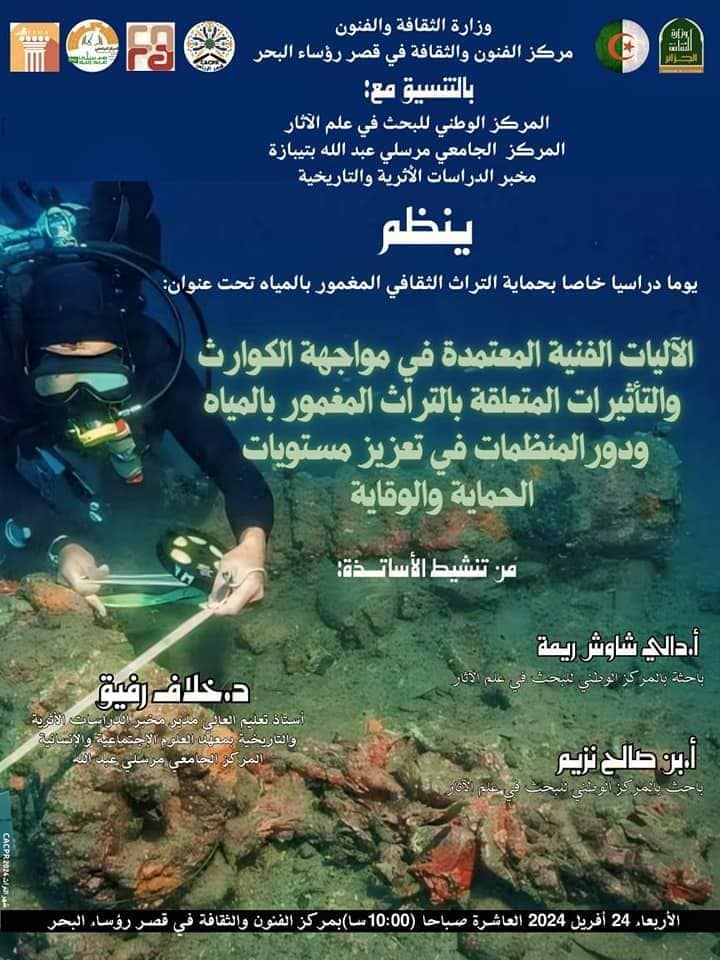 بدعوة من مديرة مركز الفنون و الثقافة في قصر رياس البحر، شارك المركز الجامعي لتيبازة، ممثلا من طرف الاستاذ الدكتور خلاف رفيق مدير مخبر الدراسات التاريخية والأثرية، في فعاليات اليوم دراسي الموسوم الآليات الفنية المعتمدة في مواجهة الكوارث والتأثيرات المتعلقة بالتراث المغمور بالمياه ودور المنظمات في تعزيز مستويات الحماية والوقاية.