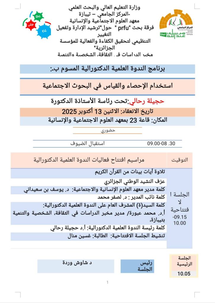 نظم معهد العلوم الاجتماعية والإنسانية ندوة دكتورالية حول إستخدام الإحصاء والقياس في العلوم الاجتماعية، من تنظيم فرقة بحث PRFU برآسة الأستاذة رحالي حجيلة وبالشراكة مع  مخبر البحث في الثقافة والشخصية والتنمية ومديره الأستاذ عبورة محمد، وكانت انطلاقة الندوة بكلمة مدير المعهد بن سعيداني يوسف وبحضور مكثف لطلبة في مختلف المستويات والتخصصات وبمشاركة مجموعة من الأساتذة من المعهد الذين يتميزون بخبرة في هذا المجال كالأستاذة بكير مليكة والأستاذة زايير نصيرة والدكتورة بلعباسي إسمهان والدكتور عليلي عبد الوهاب والدكتورة شراير كوثر، لأجل توضيح الرؤية للطلبة وتدارك المشكل والصعوبات التي تعترضهم خاصة أثناء سنة التخرج أهمها مرحلة الماستر. وأثرى النقاش بتدخل أساتذة أمثال الأستاذة نصيب نعيمة والأستاذ دلدول جمال .واختتمت الندوة بتوصيات أهمها توعية الطلبة بأهمية وضرورة الإحصاء والقياس وتدريبهم، وعقد ندوات وملتقيات باستمرار حول الموضوع .